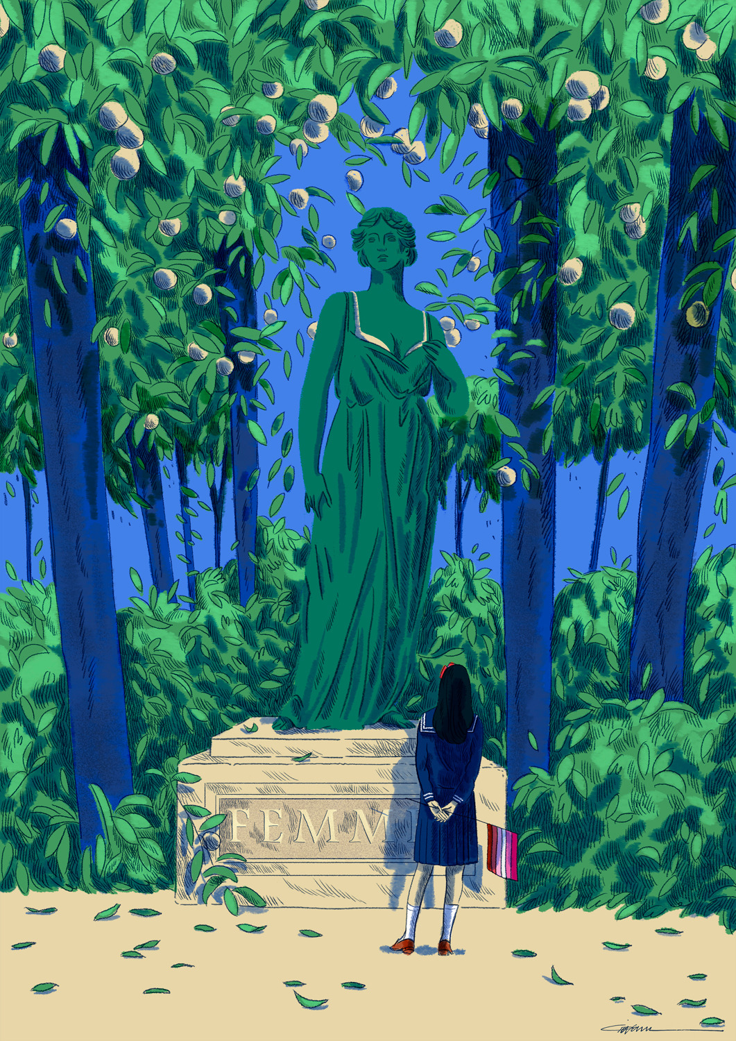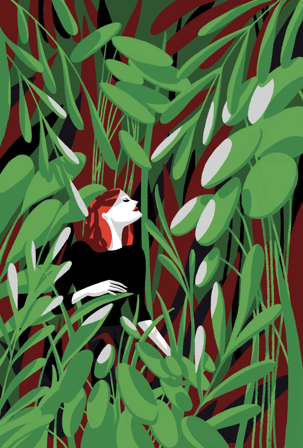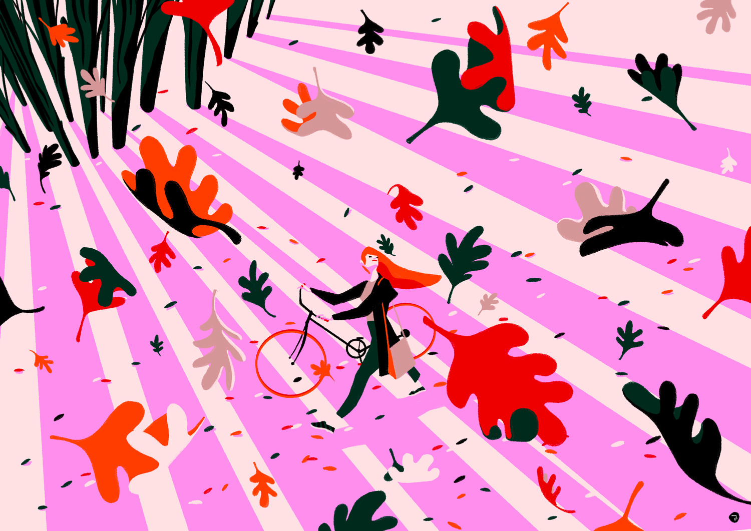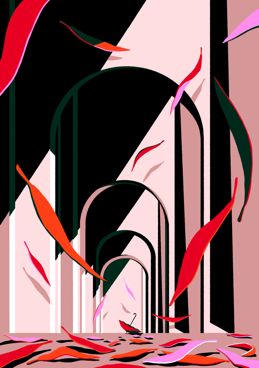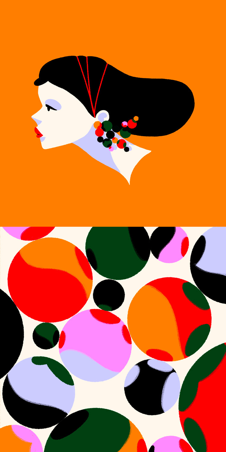 She creates quiet illustrations where the viewer can momentarily immerse themselves in a rectangle of tranquillity. Her style is characterised by the use of bright and vibrant colours, inspired by nature and architectural settings – large architectural structures, urban landscapes, lush jungles, unusual plants, refined textiles, and well-furnished rooms heavily influence her visual world.