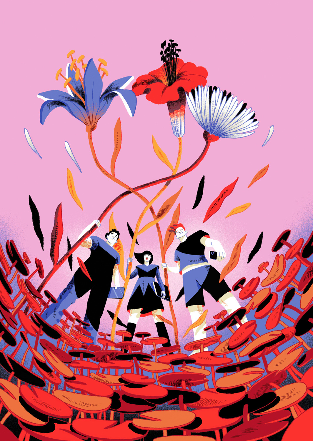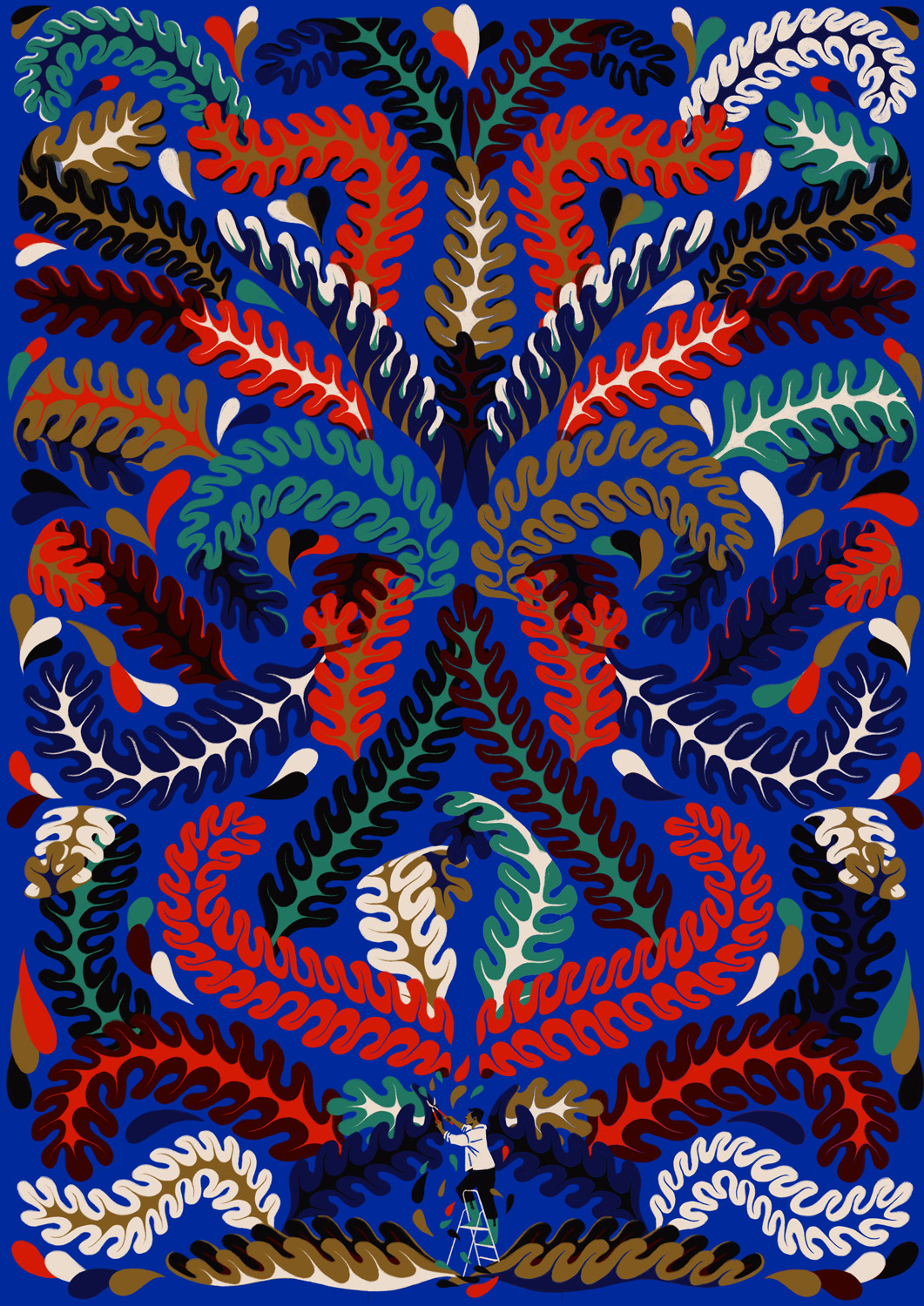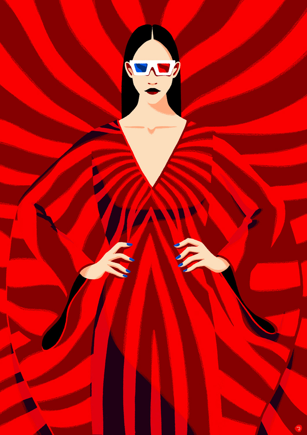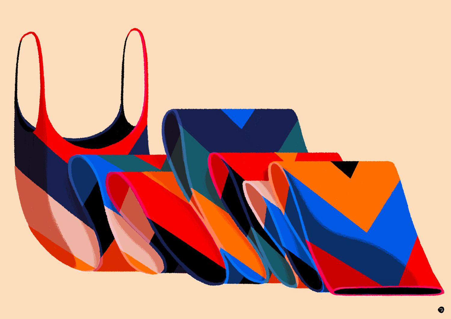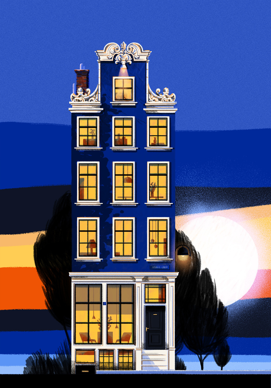 She creates quiet illustrations where the viewer can momentarily immerse themselves in a rectangle of tranquillity. Her style is characterised by the use of bright and vibrant colours, inspired by nature and architectural settings – large architectural structures, urban landscapes, lush jungles, unusual plants, refined textiles, and well-furnished rooms heavily influence her visual world.