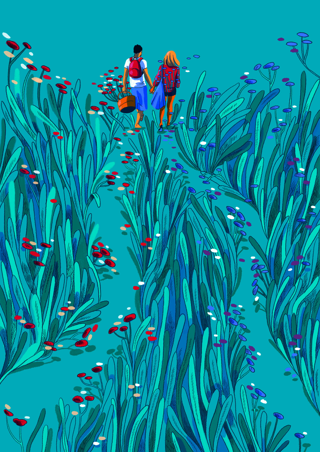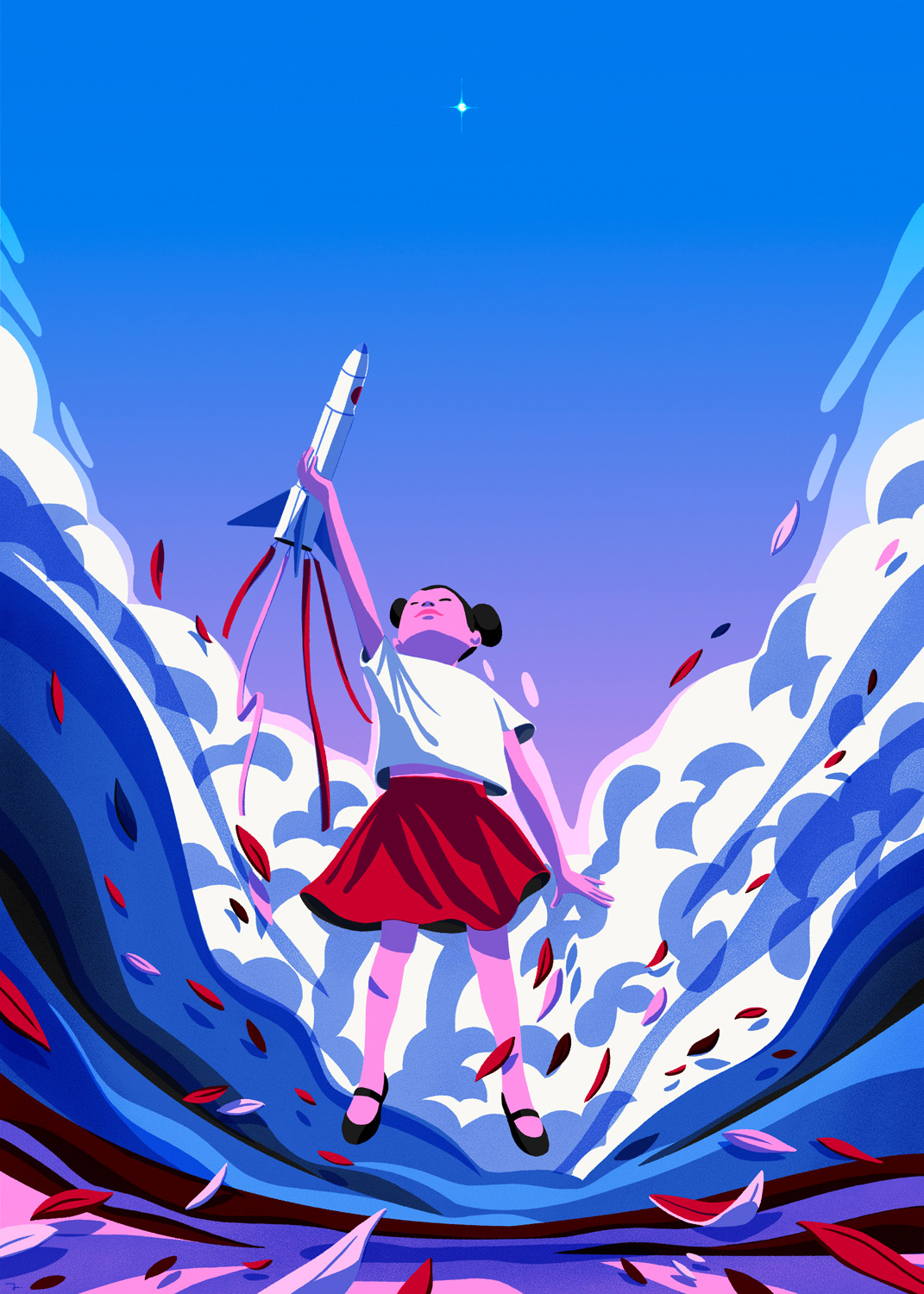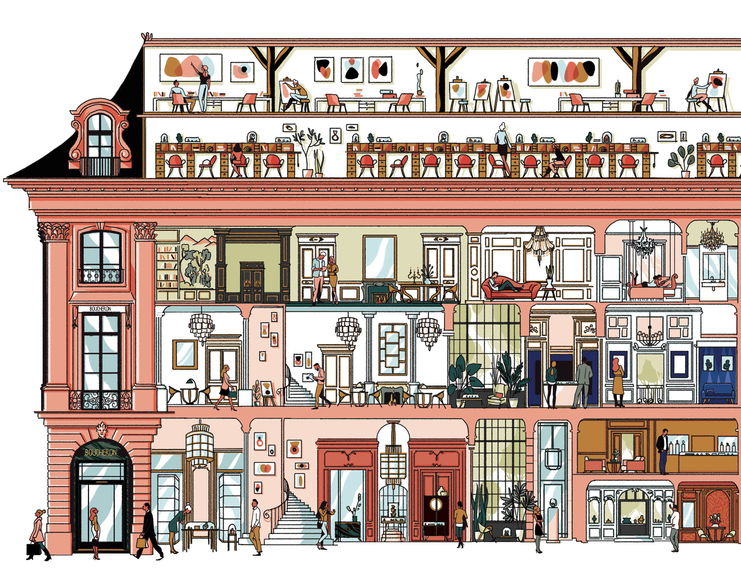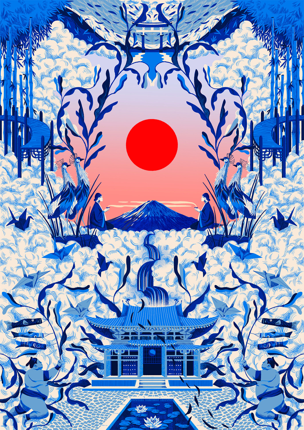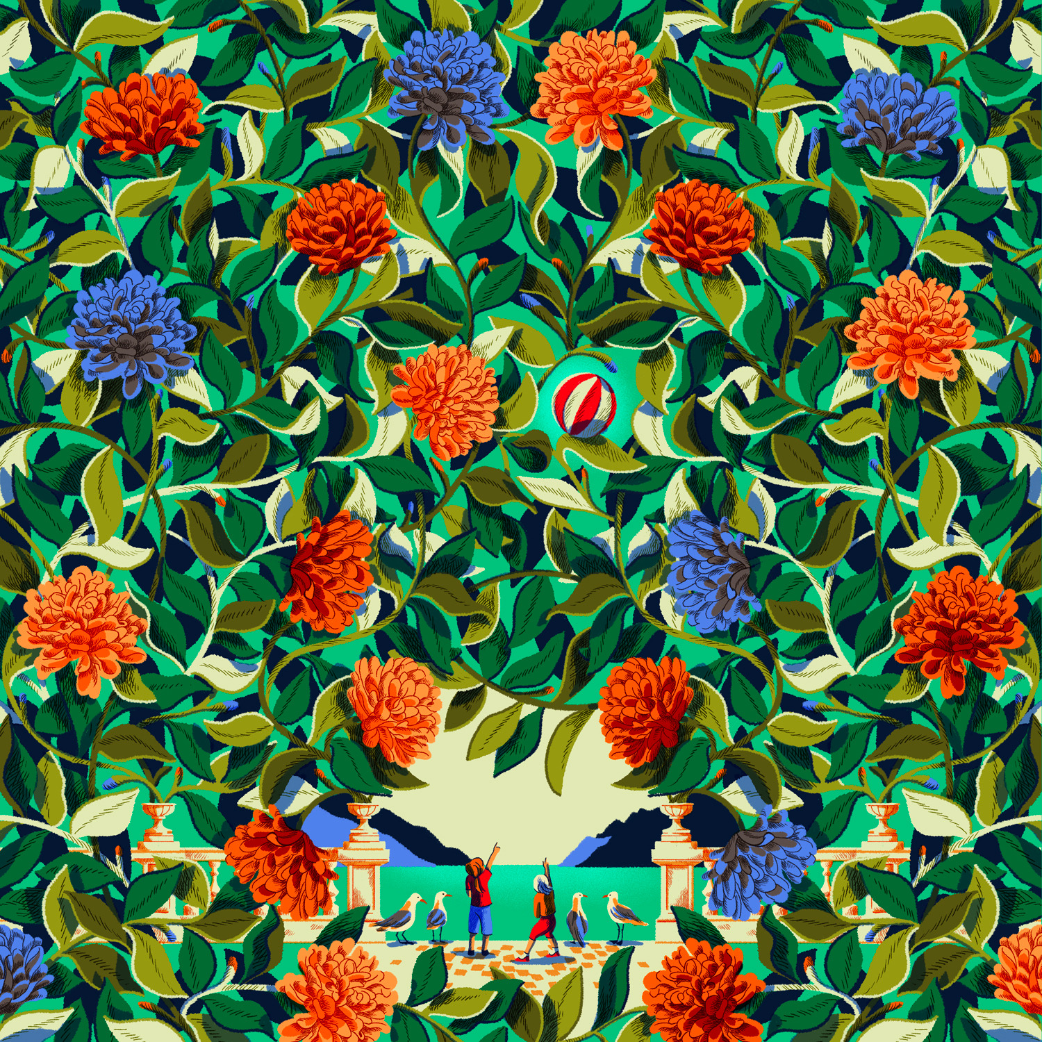 She creates quiet illustrations where the viewer can momentarily immerse themselves in a rectangle of tranquillity. Her style is characterised by the use of bright and vibrant colours, inspired by nature and architectural settings – large architectural structures, urban landscapes, lush jungles, unusual plants, refined textiles, and well-furnished rooms heavily influence her visual world.